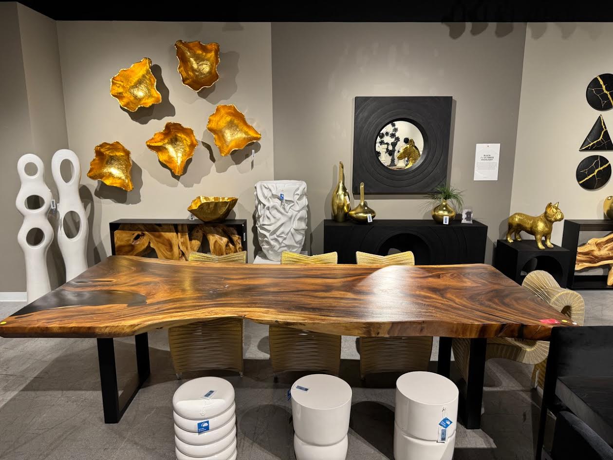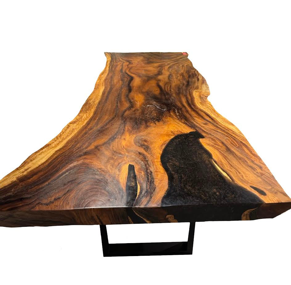 one of a kind, natural color, resin and live edge dining table, satin black legs