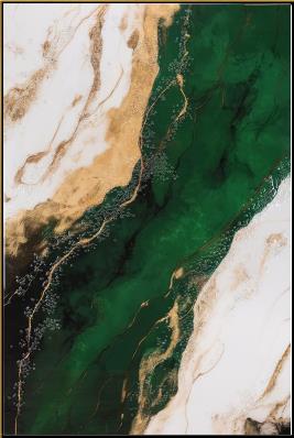wall art. green, gold, and white, textured crystal art, floating gold frame